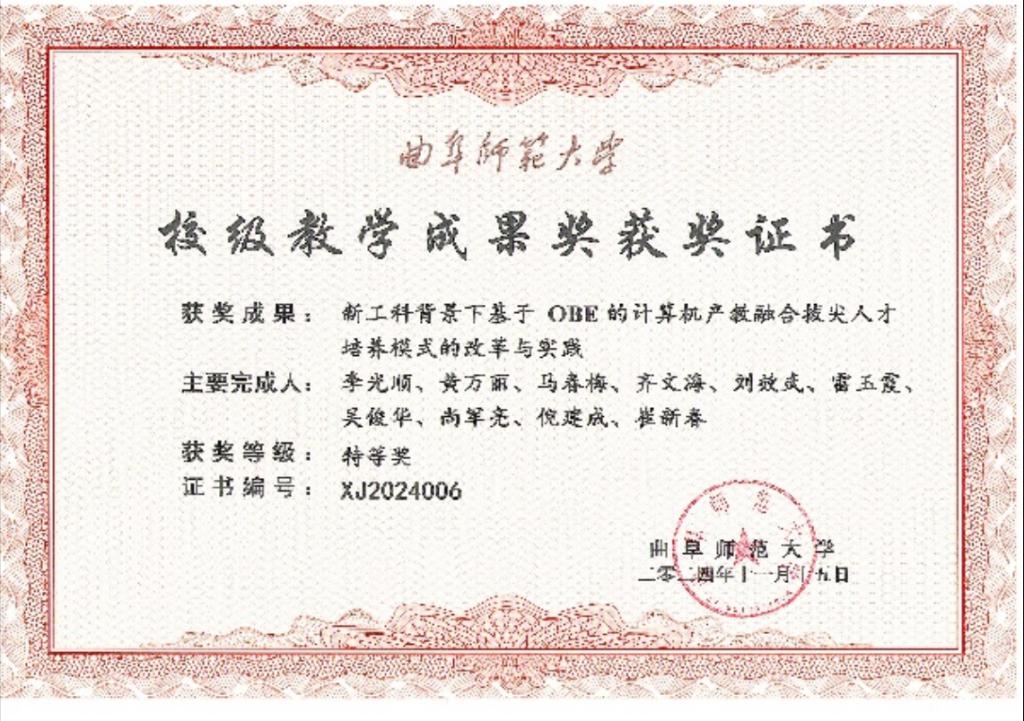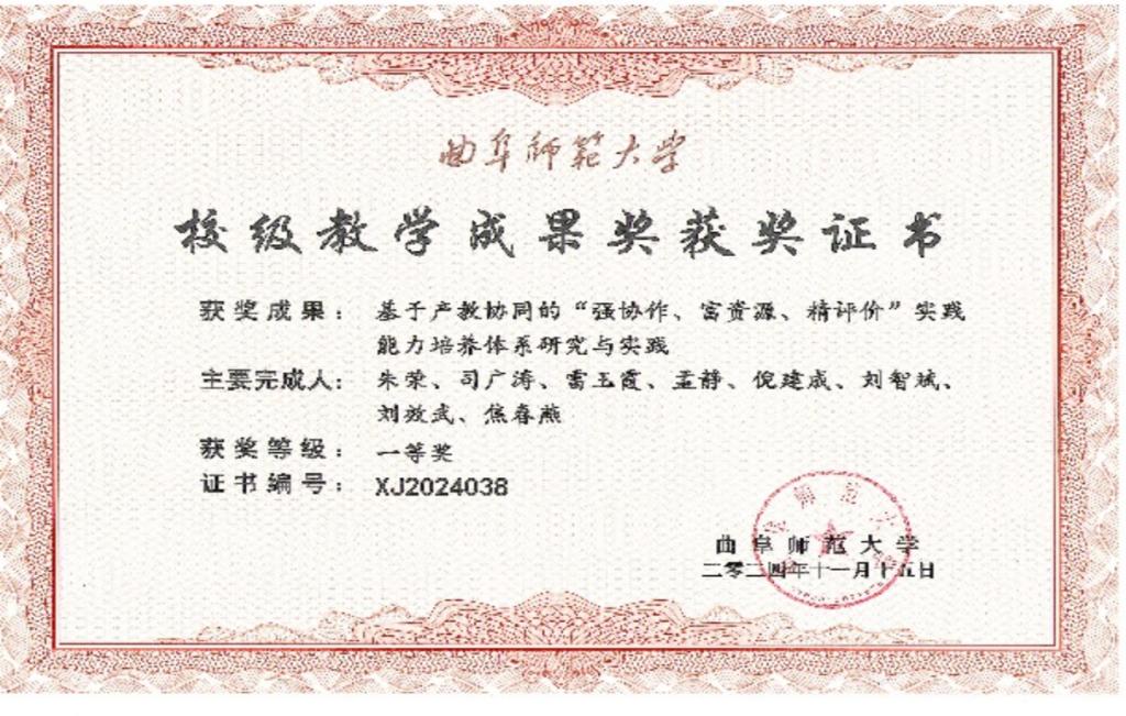2024年,马春梅副教授负责的课程《并行与分布式计算》获批山东省研究生教育优质课程、王华副教授负责的课程《嵌入式系统开发技术》获批山东省优质专业学位案例库。刘金星教授、赵景秀教授指导的研究生张岱君的硕士学位论文《面向单细胞测序数据的细胞类型识别方法的研究》荣获获山东省优秀研究生硕士学位论文,尚军亮教授、刘金星教授指导的研究生的成果《基于信息相似性的预测推荐方法研究与应用》以及刘金星教授、孙渊导师指导的研究生的成果《面向生物医学数据的智能算法研究及应用》荣获研究生创新成果奖,李光顺教授领导的人工智能导学团队获校级十佳优秀研究生导学团队。