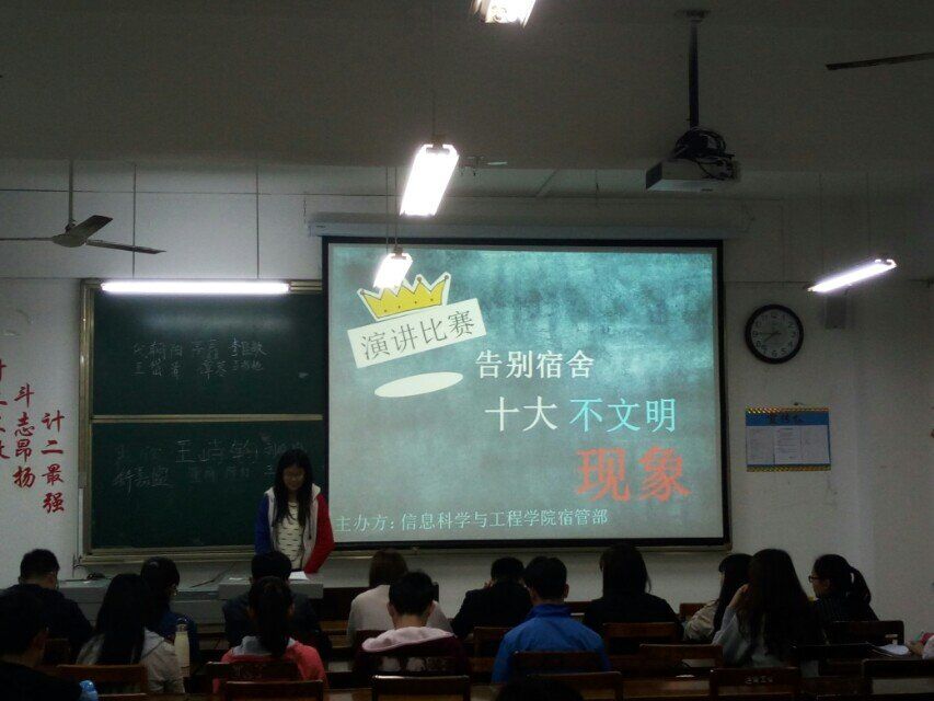 学生社区自律委员会开展的“宿舍文化内涵提升年”活动,由信息科学与工程学院宿管部主办于的“告别宿舍十大不文明现象”演讲比赛初赛于教室c407盛大开幕。
