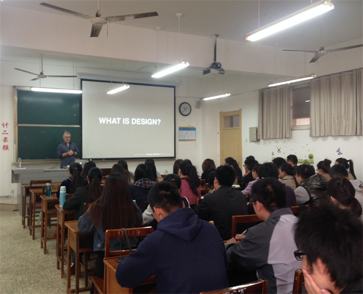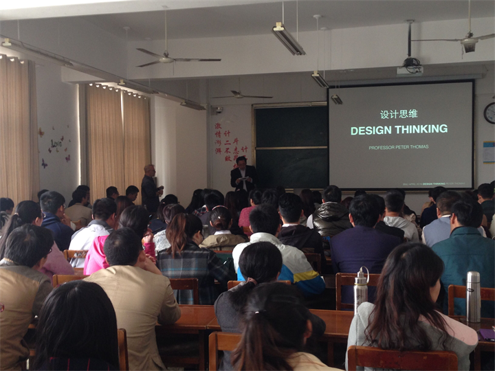 讲座中Peter Thomas教授首先通过“What is design”这个问题,向在场的同学提问,与同学们进行互动,引出整个报告。然后将报告分为“What makes design thinking successful”和“How does design thinking work”两个部分分别作了讲解。报告中,Peter Thomas教授的讲解幽默风趣,吸引大家跟随他的讲解。