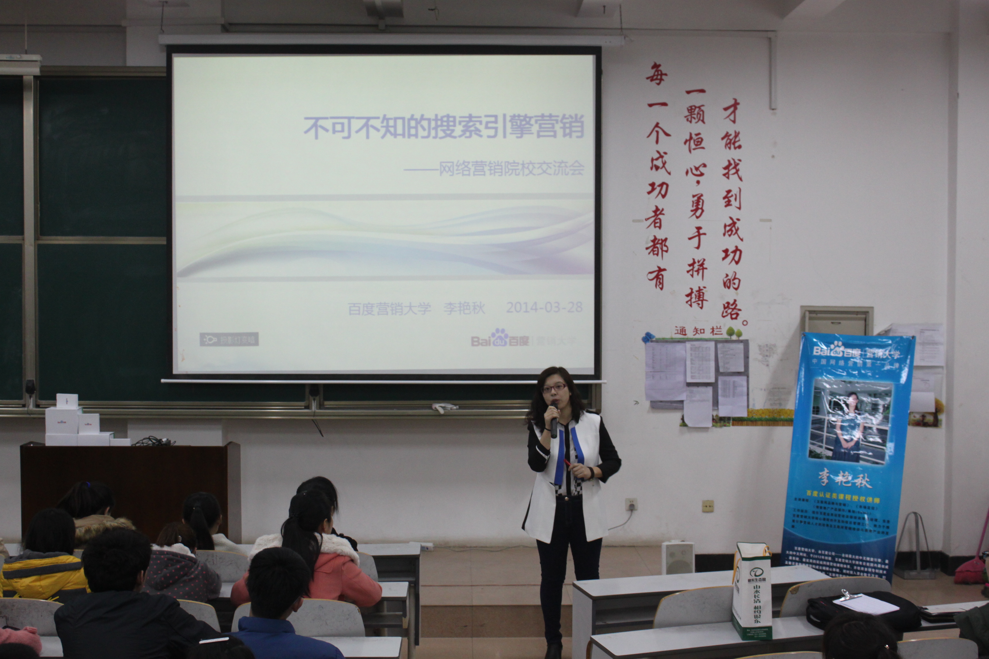 日照校区JE303举行。百度营销大学总部的李艳秋老师为计科学子介绍搜索引擎营销的相关知识。
