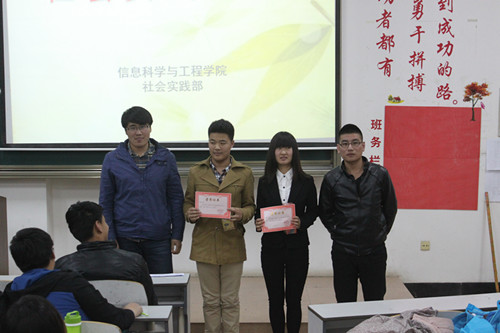 此次活动由十名选手带来他们自己的社会实践故事,分享了自己精彩的社会实践经历。其中,14级的刘孝迎同学讲了他对社会实践的理解以及在假期实践中的经历。他提出“读万卷书,行万里路”是不可分割的,并不能只读书或只一味的到处行走,要做到“知行合一”。社会实践就是知与行的结合,而人生更应如此。他讲的十分的生动,在座的同学给予他很热烈的掌声。活动尾声,学生会主席朱晓曦对此次活动进行了总结发言,提出在生活中不要只看不做,实践从身边的是做起。最后,在做嘉宾为获奖的同学进行颁奖。