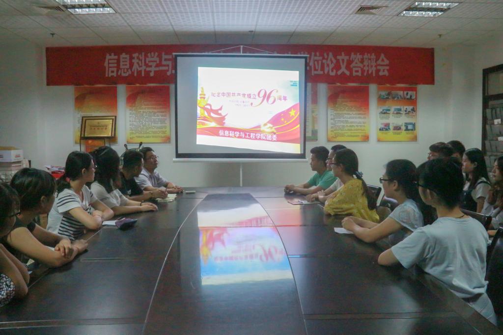 为响应学校党委办公室号召,隆重庆祝中国共产党成立96周年,7月1日上午9时信息科学与工程学院于C1011组织开展了庆祝中国共产党成立96周年学习讨论会,团委书记毕文波主持本次会议,团委学生会主要成员参与了本次活动。
