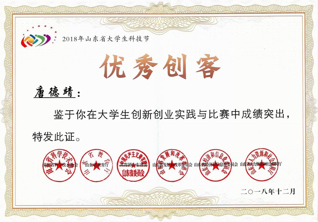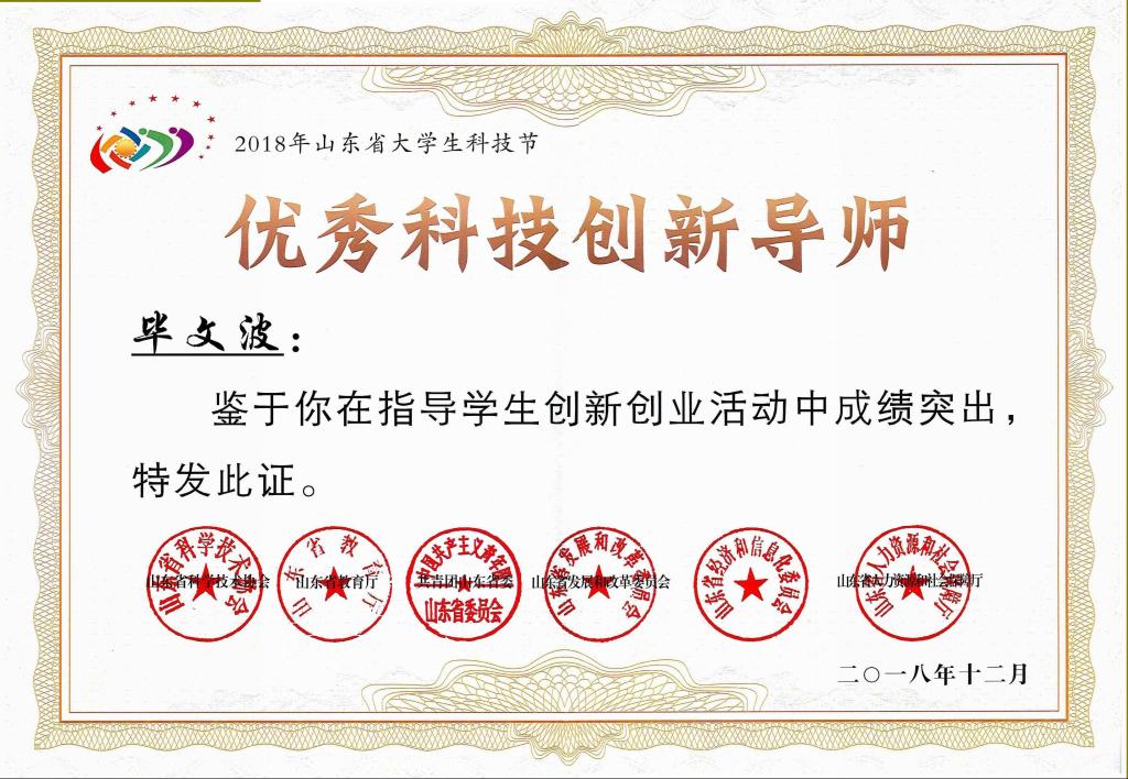 信息科学与工程学院团委书记毕文波、2016级学生唐德靖获评山东省优秀科技创新导师和山东省大学生优秀创客。