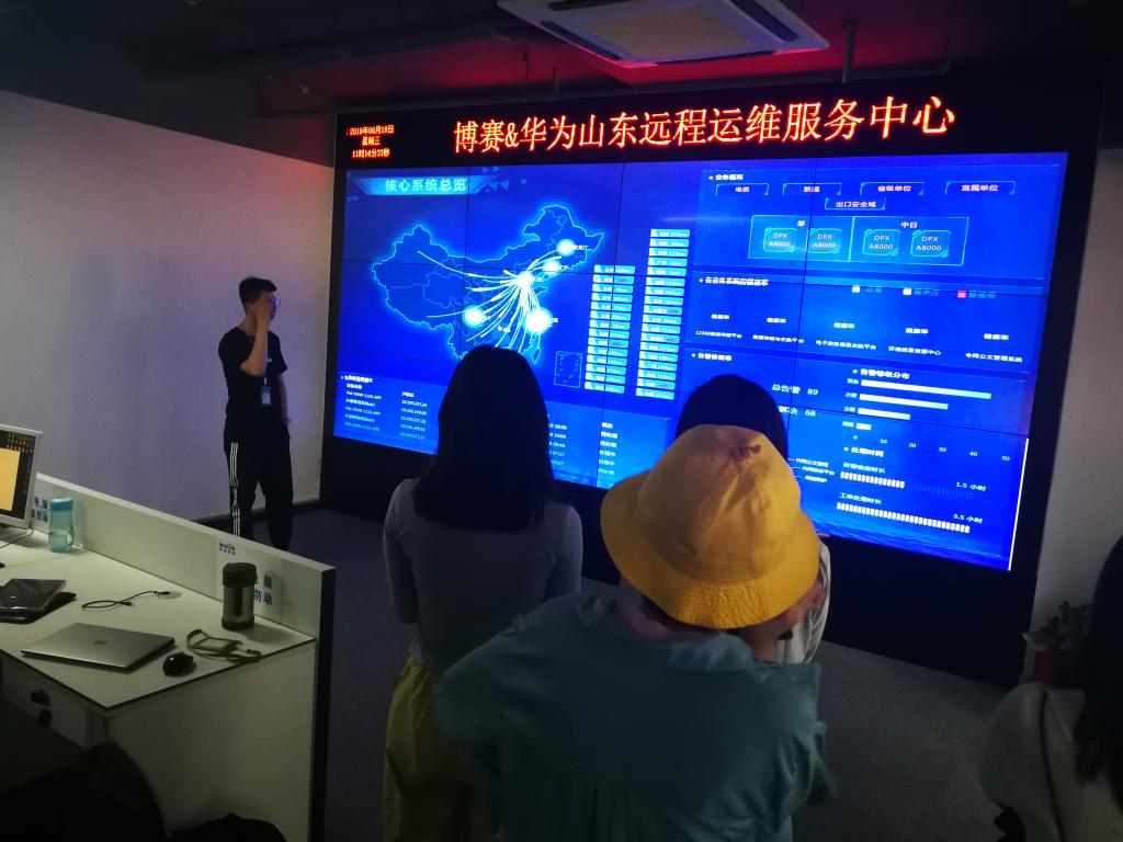 在济南博赛网络科技有限公司,工作人员分批带领老师、同学进行参观学习。师生们参观了公司的工作环境,了解了博赛网络科技有限公司的课程模式、工作理念,工作人员向广大师生讲解了樱花动漫、背景和良好的校企合作对接环境。见习师生还参观了公司的考试中心和华为&博赛远程运维平台,平台具有提供线上、线下的运维能力,工作人员现场展示了远程运维的设备。