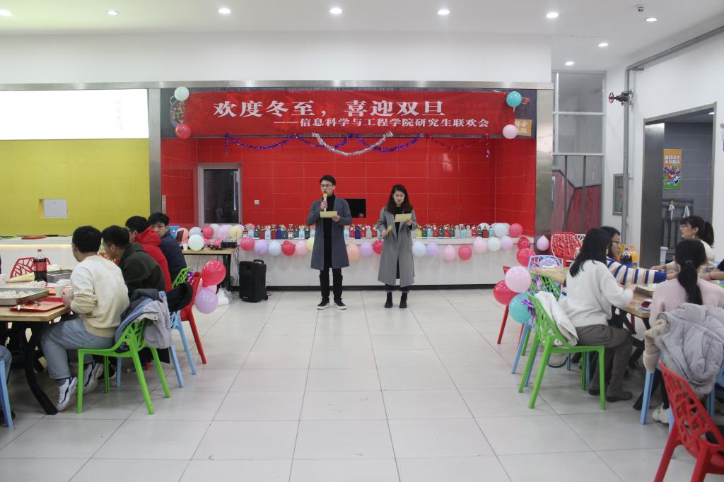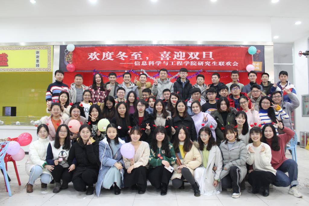 2019年12月22日,信息科学与工程学院研究生“欢度冬至,喜迎双旦”联谊会在四季餐厅二楼举行。信息科学与工程学院院长助理王茂励老师、研究生辅导员尚军亮老师、董兆安老师以及全体研究生参加了本次活动。
