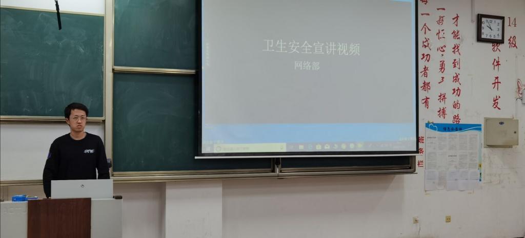 安全委员为各班播放了关于卫生安全的宣讲视频,视频中首先列举了多个曾经出现的案例,通过了解现实生活中的卫生事故,同学们意识到了卫生安全的重要性。片中曝光了多家卫生不合格餐馆,以此提醒学生从正规商家购买食品,时刻注意食品卫生,防止因食用不卫生食物而危害身体健康的情况发生。随后,视频介绍了我国抗美援朝期间所兴起的爱国卫生运动,使同学们了解到我国对人民的卫生安全高度重视。视频最后,着重强调了咬指甲以应对压力、棉签清洁耳朵、上厕所后不洗手、不经常更换牙刷、错误的刷牙方式等12个个人卫生问题,并介绍了处理个人卫生问题的技巧和注意事项。