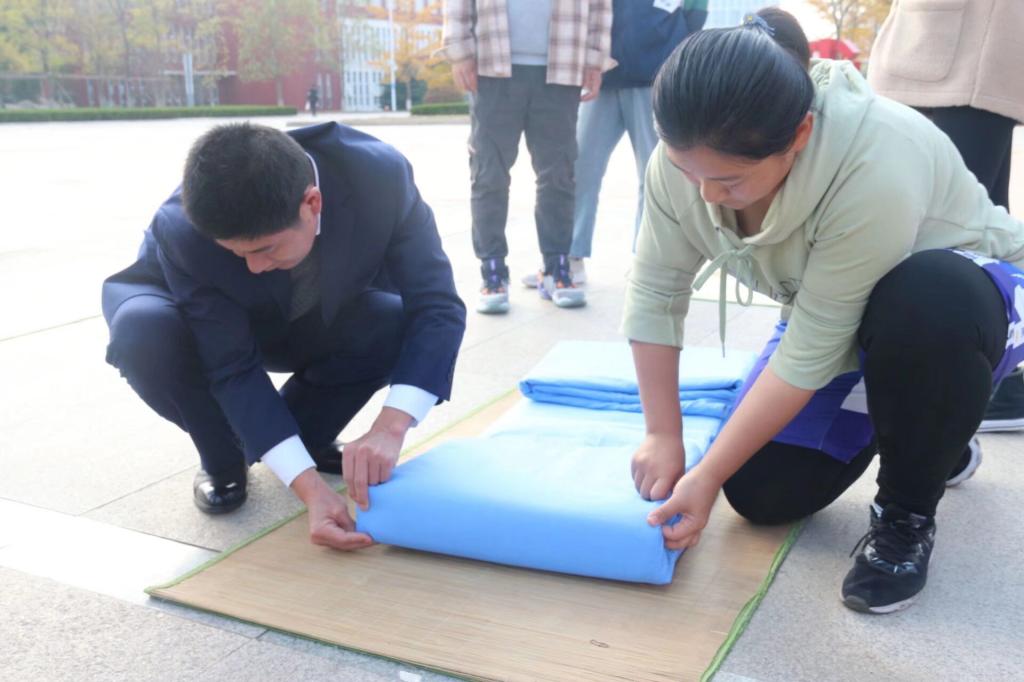 于日月广场成功举办叠被子大赛。学工处、武装部副部长赵秀臣、樱花动漫