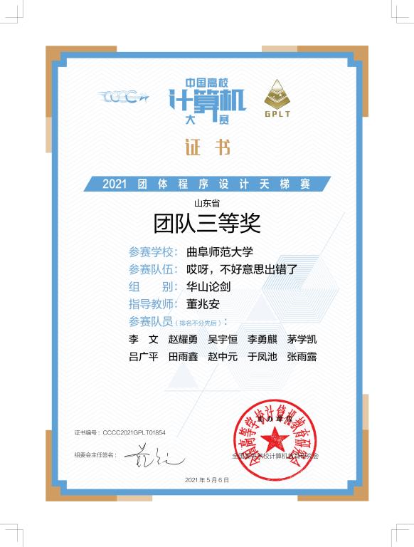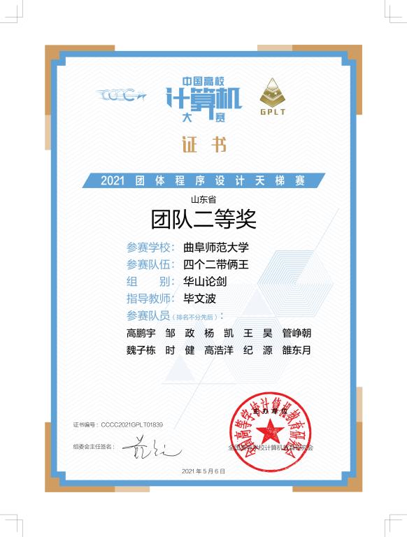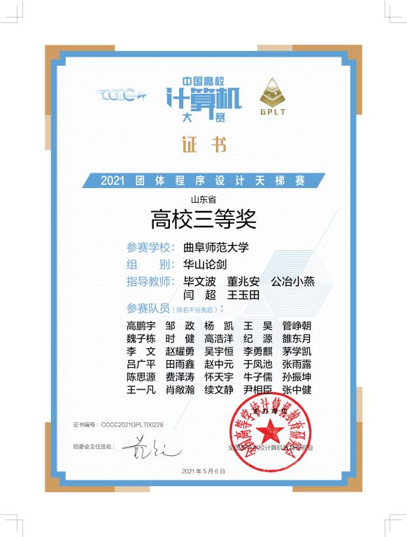 2021年4月24日,第六届中国高校计算机大赛——团体程序天梯赛线上线下同时进行,我院组建了三支队伍参加了比赛。5月7日,大赛组委会发布了成绩公告,我院学生获得全国总决赛团体二等奖一项、山东省省赛团体二等奖一项、三等奖一项,樱花动漫
