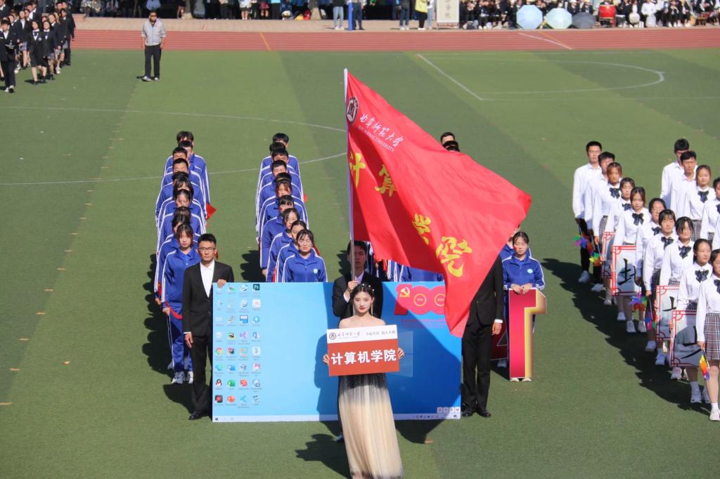 伴随着振奋人心的《运动员进行曲》,国旗护卫队精神抖擞,意气风发,阔步经过主席台接受领导和老师的检阅。随后,计算机学子身着蓝色院服踏着整齐划一的步伐,高举院旗走向主席台,他们以整齐划一的步伐向大家展现了计算机学子特有的朝气,同时也向大家展示计算机学子的自信与热情。“扬帆起航,劈波斩浪。计算人才,编译未来。 ”的高亢嘹亮的口号向我们展现出昂扬的精神风貌。方队入场后,进行升旗仪式,五星红旗在全校师生的注目下冉冉升起。最后,全体师生共同观看开幕式文艺演出。我院学子表演青春向上的广播体操,表演者用自己的热情感染着现场的每一个人,更把整个开幕式的气氛推向高潮。