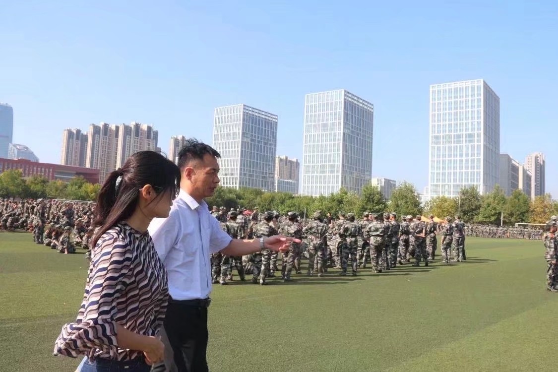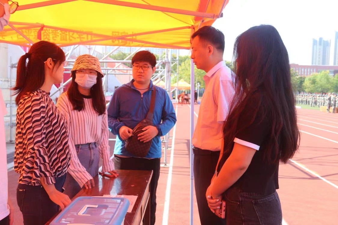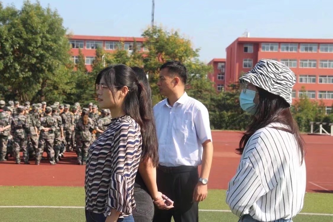 党委副书记孙旭春、本科生党支部书记于运清、辅导员孙宇、杨丹丹、孙泽玮前往操场慰问正在军训的2021级学生。