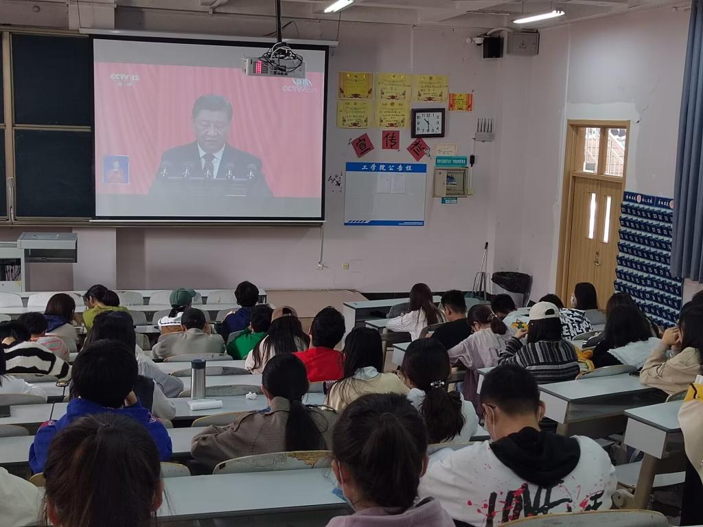 全体学生干部以及部分入党积极分子分别于E103、E105集中收看党的二十大开幕会直播,其余学生采取线上的方式自主观看,全院师生认真聆听大会开幕会内容。