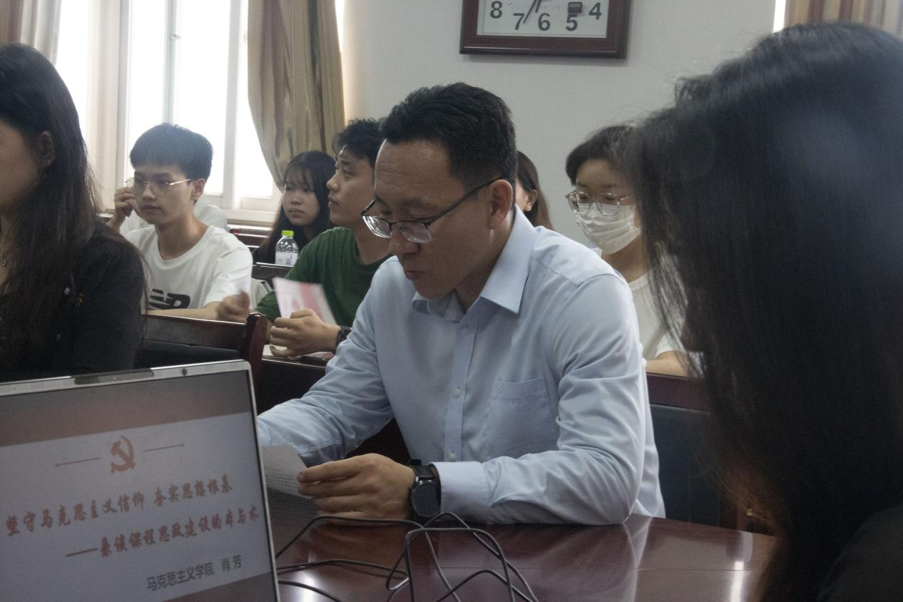 肖芳教授以《坚守马克思主义信仰 夯实思想根基——兼谈课程思政建设的本与术》为题为学院师生党员进行专题辅导,围绕“信仰”二字展开,引导党员学会如何坚守马克思主义信念,坚持马克思主义理论的重要性,希望大家做向下扎根、向上生长的人,同时肖芳教授强调,广大的教师要理清“课程”和“思政”之间的关系,掌握课程思政建设,成为“点燃”学生的大先生。整个讲座过程幽默风趣,既有理论高度,又有思想的深度,收获了在座学生和老师的阵阵掌声。