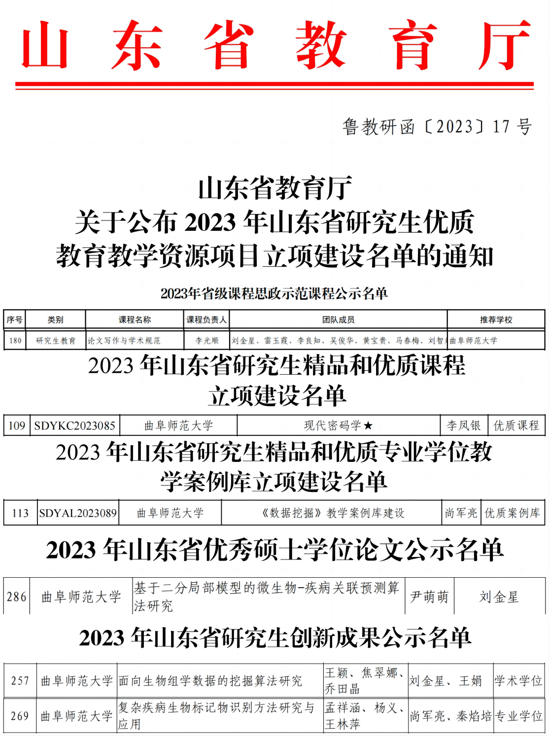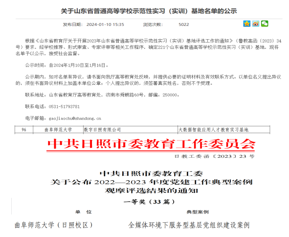 2023年12月29日,山东省教育厅公示2023年度山东省本科教学改革研究项目,李光顺教授主持的《基于OBE的计算机专业产教融合卓越人才培养模式创新与实践》山东省教改重点项目获批立项。我院同时获批校级思政示范学院建设项目1项、作为重要成员参与山东省普通本科高校重点领域教学改革试点项目(山东省“111”计划)1项。