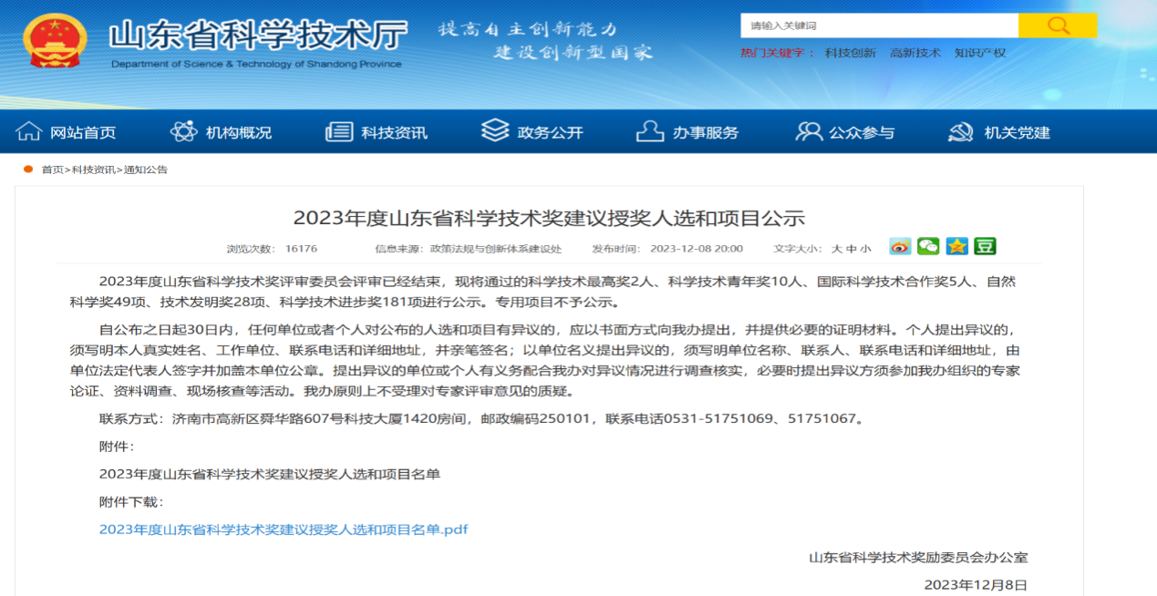 三、获得山东省科学技术奖2项,标志性成果取得历史性突破
