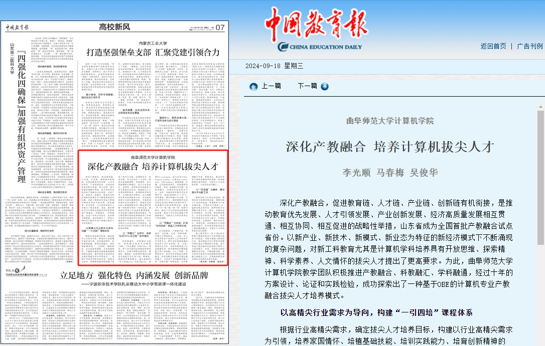 :深化产教融合 培养计算机拔尖人才》为题,报道了我院关于计算机专业产教融合拔尖人才培养模式的教学成果。