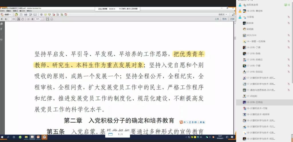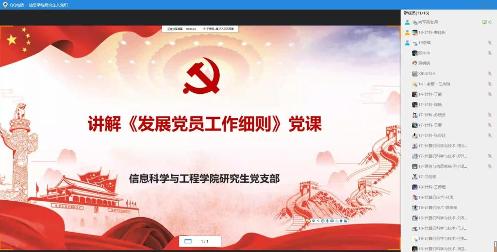 为进一步端正入党积极分子的入党动机,做好基层组织发展党员工作。6月5日下午4点,信息科学与工程学院研究生党支部组织开展线上专题党课活动,本次党课以解读《樱花动漫 发展党员工作细则》为主题,信息科学与工程学院研究生党支部书记尚军亮出席并担任主讲,支部全体入党积极分子参加了本次党课。