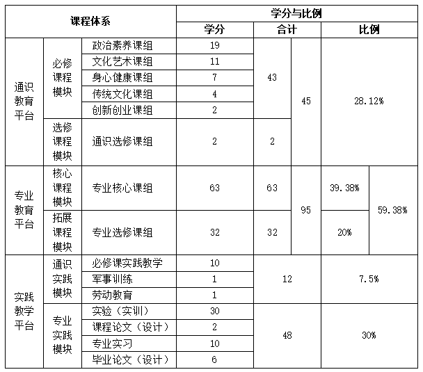 说明:表中通识必修课程模块的45学分中,含通识实践模块中必修课程实践教学的10学分;专业教育平台的95学分中,含专业实践模块实验(实训)的30学分。