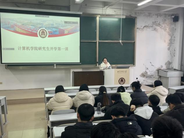 于JE104教室召开开学收心会暨“开学第一课”主题教育班会,会议由研究生辅导员程荣花老师主持。本次会议分为线下和线上两个会场,研一全体研究生参加现场会议,研二研三同学参加线上会议。