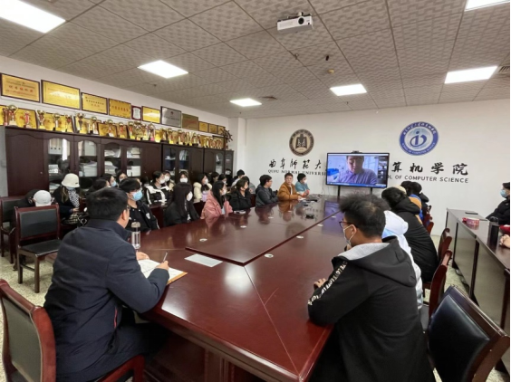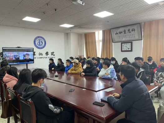 副院长尚军亮主持,山东米捷软件有限公司秦焰培总经理、北京爱语吧科技有限公司穆德国总经理进行线上宣讲,2022级全体专硕研究生参加。