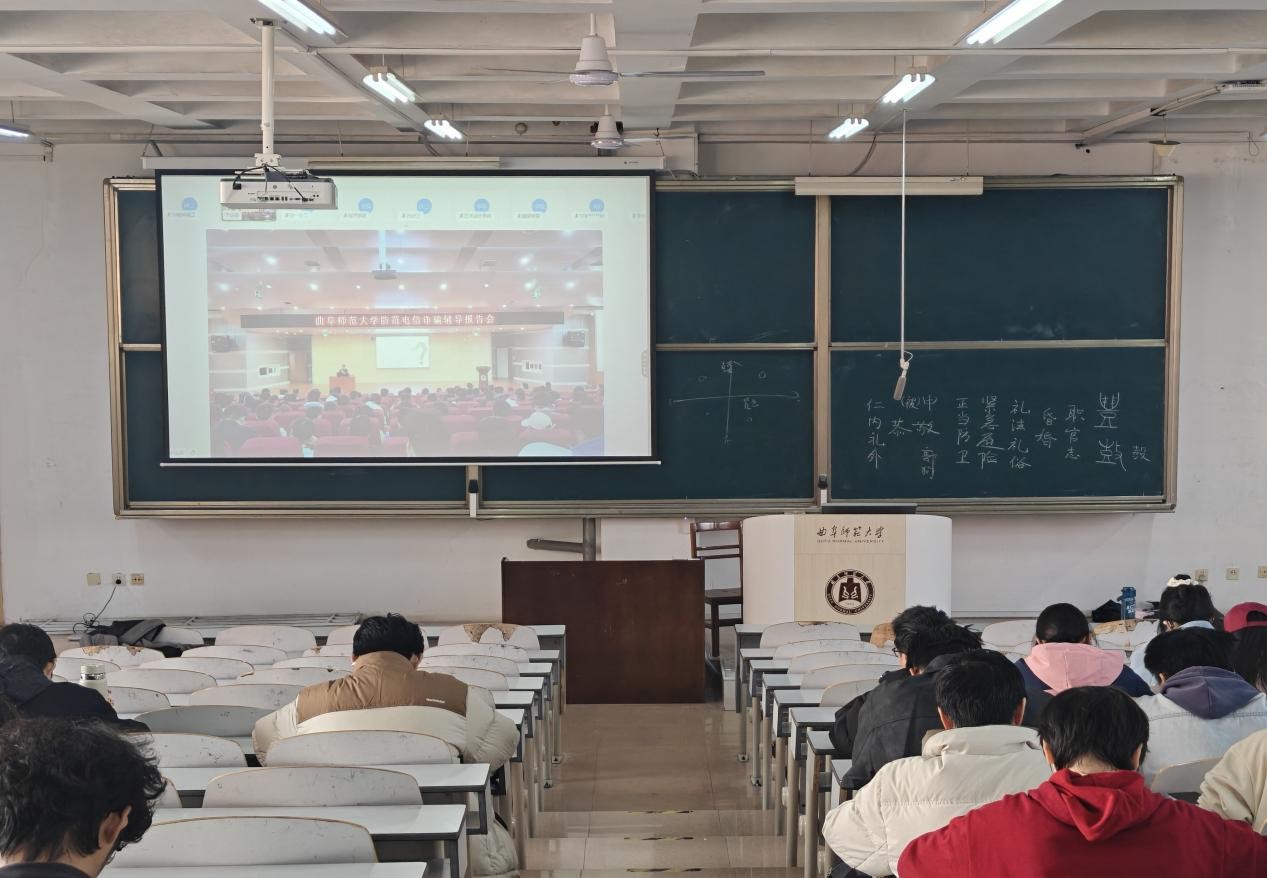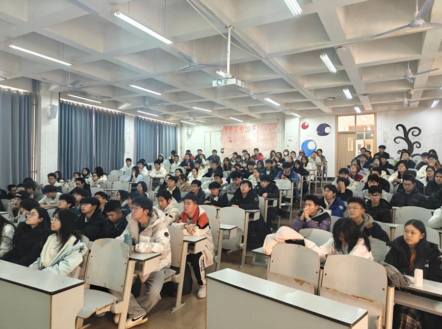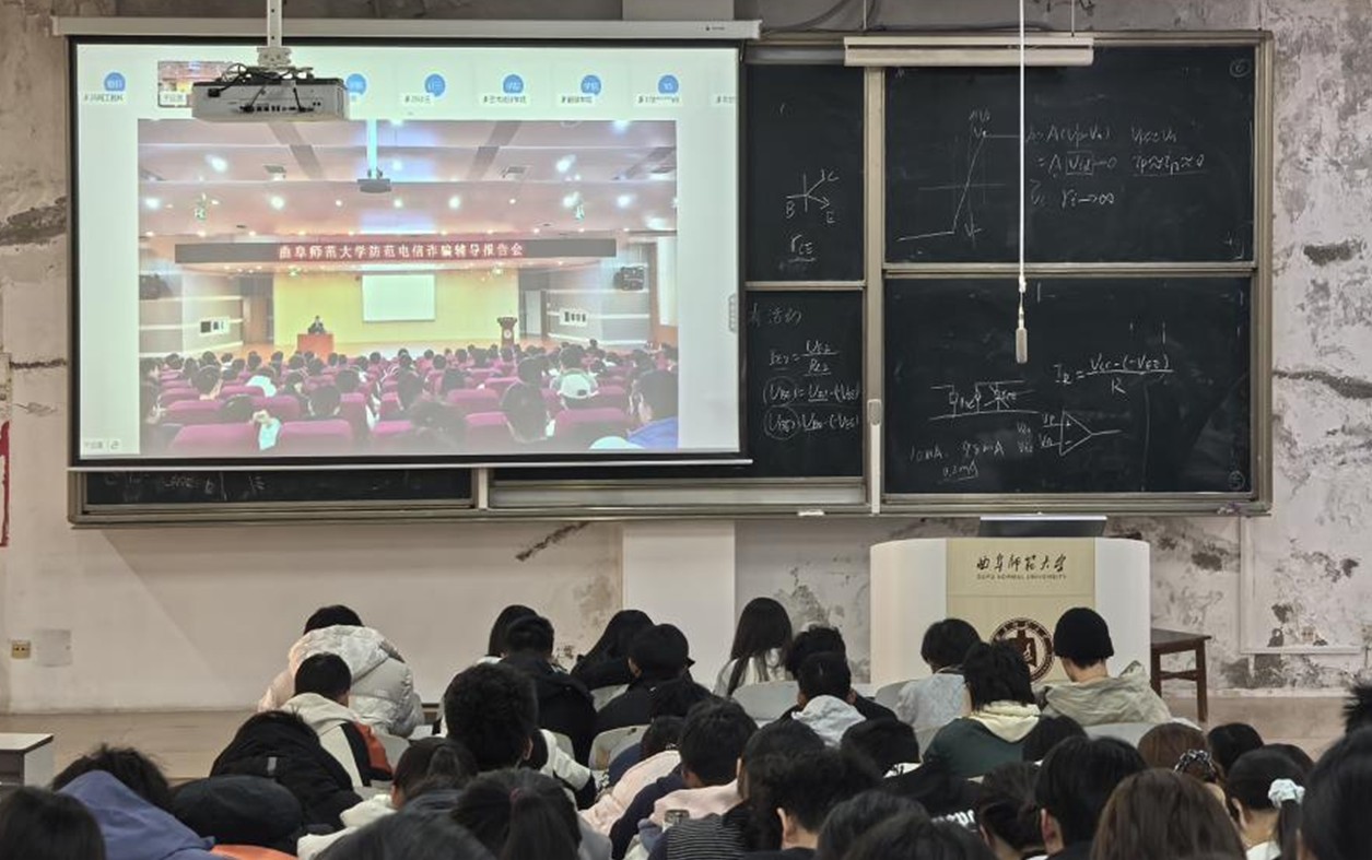 在E201、E202等六个教室组织学生观看反诈专题讲座,24、25级全体学生参与。
