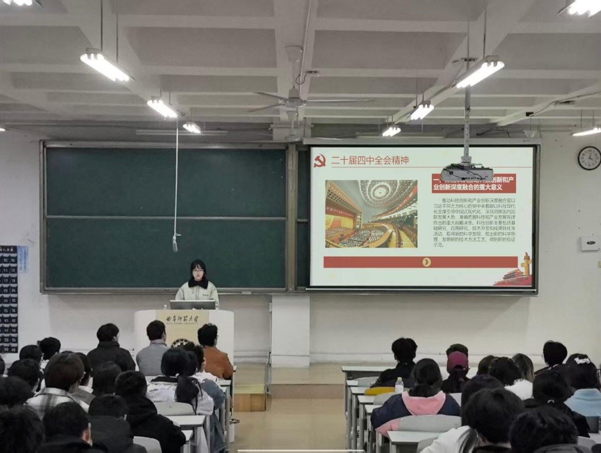 会议伊始,艾姜欢围绕党的二十届四中全会关于科技创新和新质生产力培育的重要部署,结合专业特色,从理论内涵、实践路径、青年担当三方面展开讲解。她指出,科技自立自强是国家发展的战略支撑,新质生产力的培育离不开科技创新的核心驱动,而计算机技术作为数字经济的重要基石,在其中发挥着关键作用。