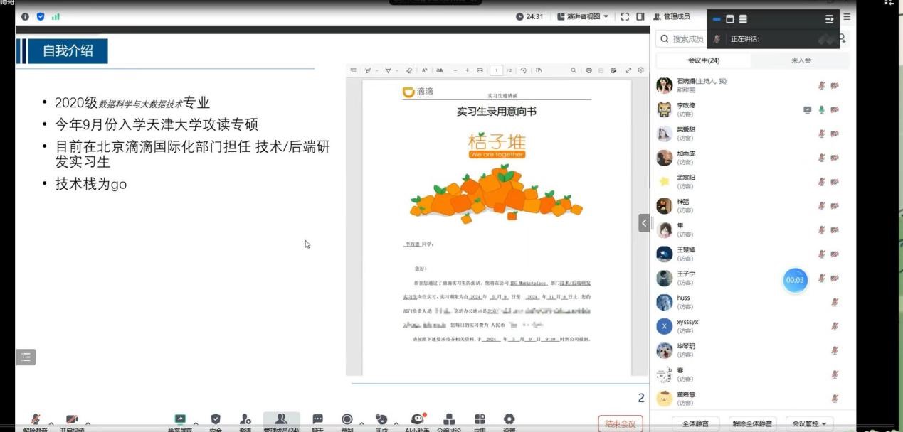 会议伊始,李政德首先详细回顾了自己从求职初期到最终成功入职的整个过程,着重强调了实习经验在求职过程中的重要性,认为实习不仅是了解行业和岗位的好机会,更是自我认知和成长的重要环节。
