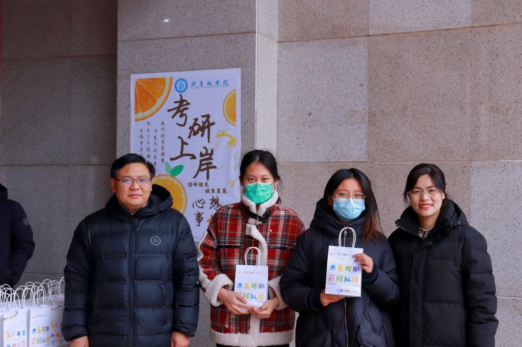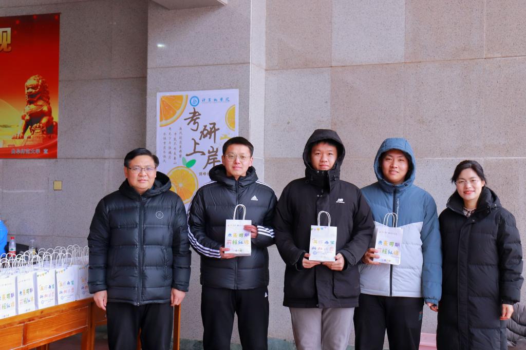 院长李光顺、团委书记于运清、2020级辅导员刘兆宇在C楼大厅为正在准备考研的学生们送上暖心祝福与考研助力包。