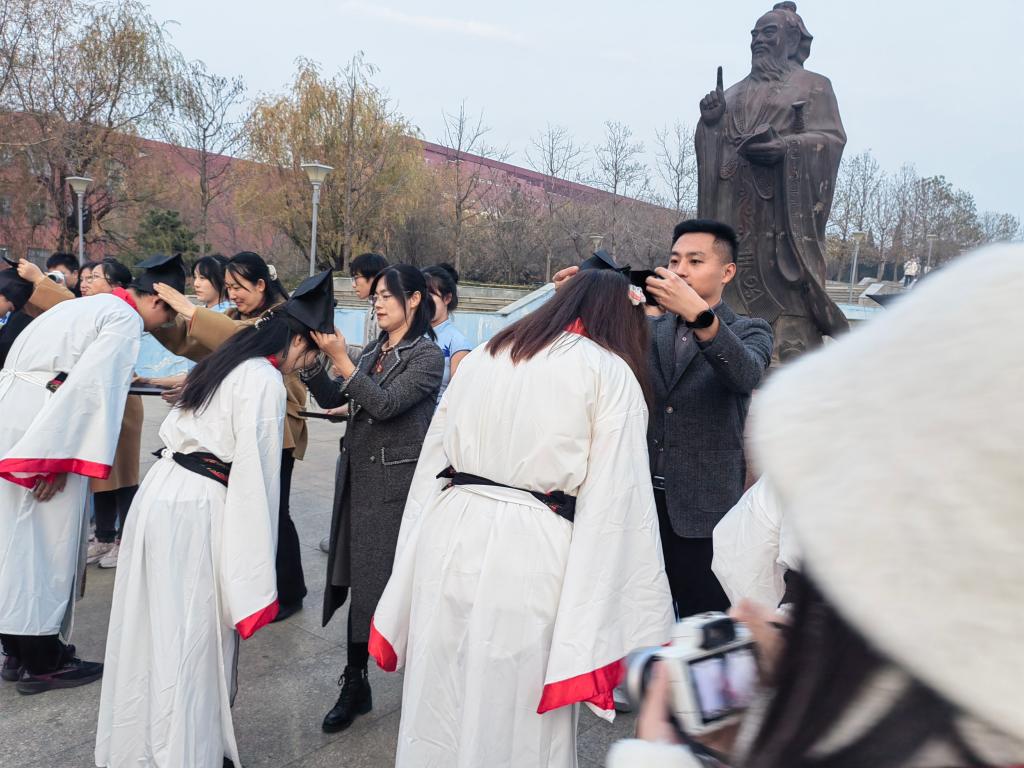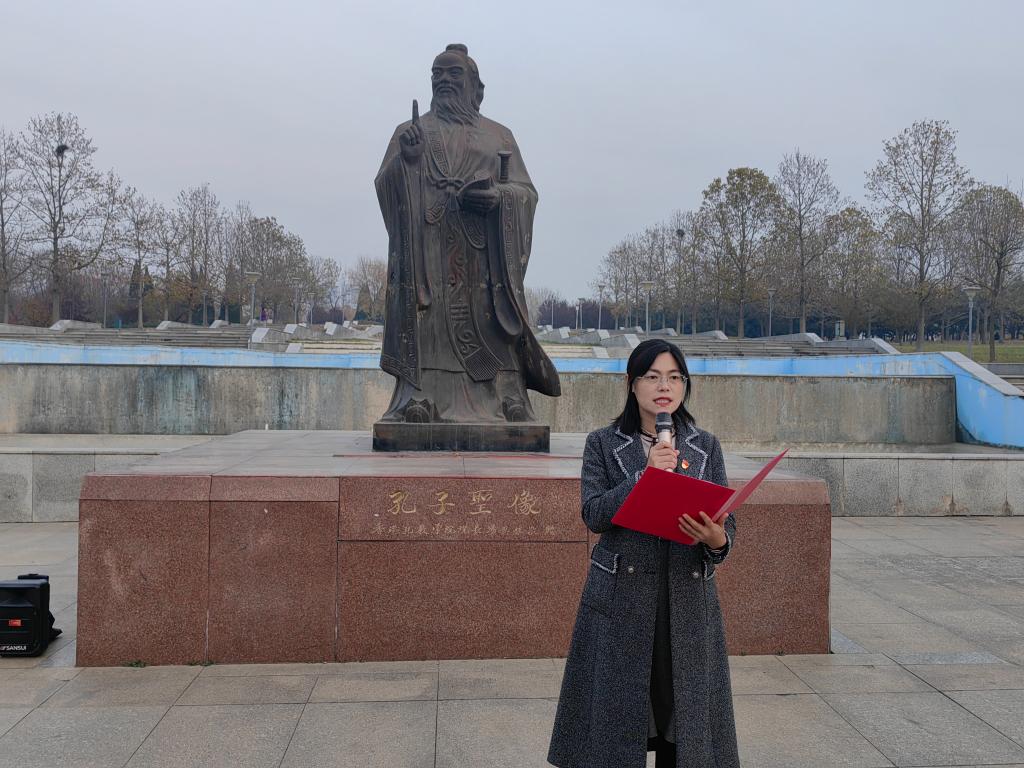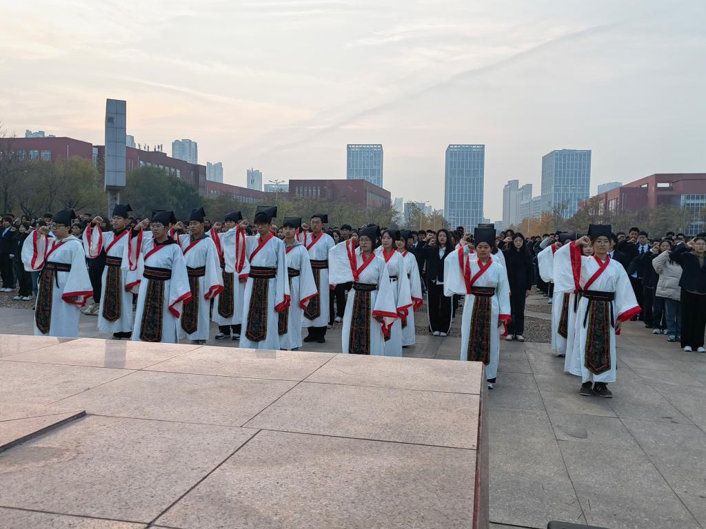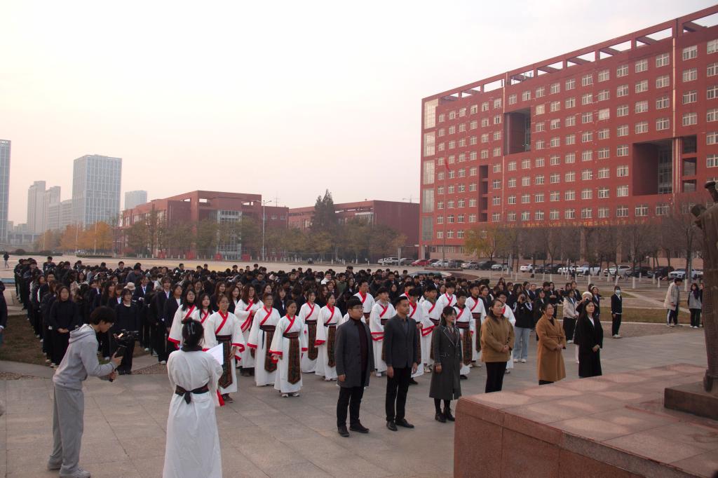 团委书记于运清老师发言。于运清老师的发言,代表了老师对同学们的殷殷期待,为每一位学子注入了新的力量,提供了宝贵意见。成人礼仪式来到尾声,嘉宾老师及2023级新生全体面谒孔子雕像行一揖礼,成人礼仪式圆满结束。