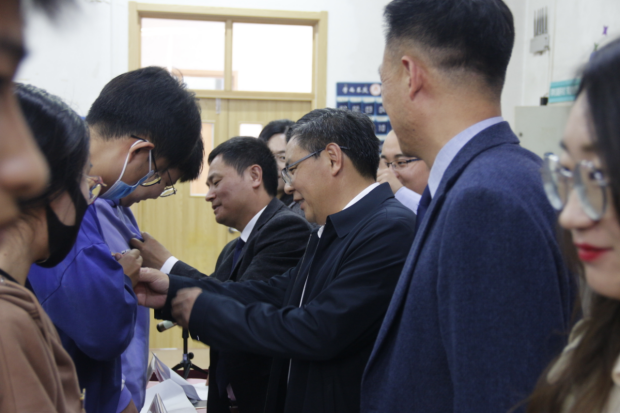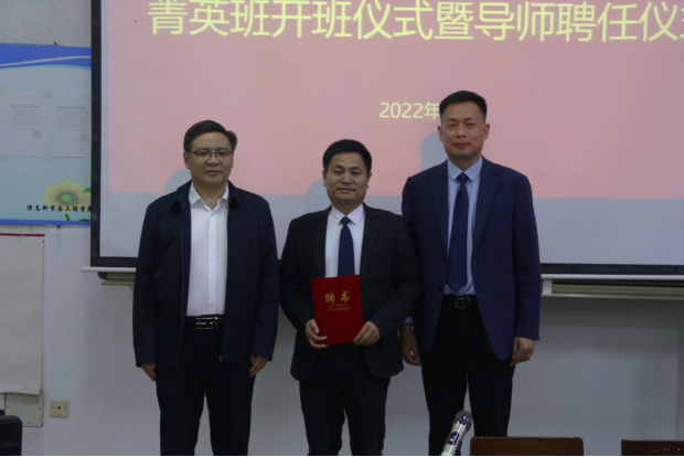 的学子们设立榜样,将有共同兴趣的优秀学子集合在一起,对其科研项目进行精准指导,从而加强学风建设,完善学科体系,健全人才,进而取得成就。第一届菁英班在过去一年中在各项比赛中取得了骄人的成绩,相信在导师的精心指导、同学的不懈努力和学院的支持下,第二届菁英班也一定会越来越好,在各项比赛中大放光彩,取得成绩。在此之后,院长李光顺及党委副书记孙旭春为董兆安老师颁发本科生导师聘书,第二期菁英班优秀成员上台,领导、老师们为他们佩戴菁英班徽章。
