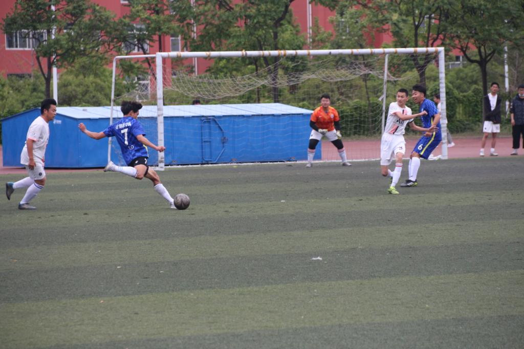 比赛上半场开始,队员们迅速进入状态。开场约二十分钟,中前场的一记长传使前场球员抓住机会,我方队员宋兴臻脚尖轻挑,球顺势打入右侧死角,我院男足以1:0暂时领先。