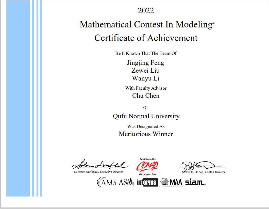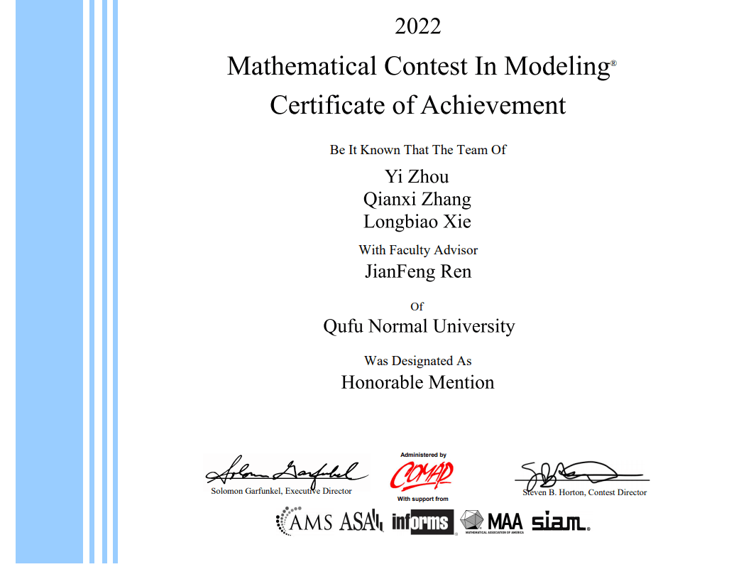 5月6日,2022年美国大学生数学建模竞赛(MCM)评奖结果揭晓。我院学子表现优异,由冯靖靖、李婉钰组成的参赛队伍荣获一等奖,另有3个参赛队伍荣获二等奖,11个参赛队伍荣获三等奖。