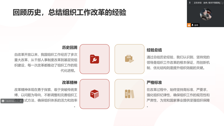 在此次党日活动中,党秘赵冉首先带领全体党员回顾历史,总结组织工作改革的经验。强调要在改革中坚持高标准、严要求,强化组织纪律性,以勇于探索、突破传统的改革精神为党和国家事业提供坚实的组织保障。赵冉还以某国企成功实施改革措施的案例进行深层次挖掘,看到了经过一系列改革实施后,组织效能显著提升,内部管理更科学的成效,这更加坚定了全体党员用改革精神和严格标准扎实做好组织工作的决心。