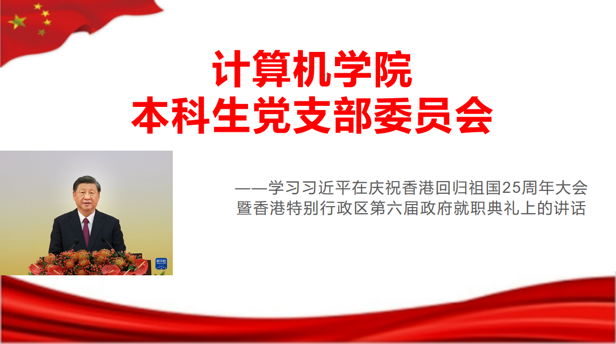 会议由本科生党支部书记孙宇主持,学习习近平在庆祝香港回归祖国25周年大会暨香港特别行政区第六届政府就职典礼上的讲话。