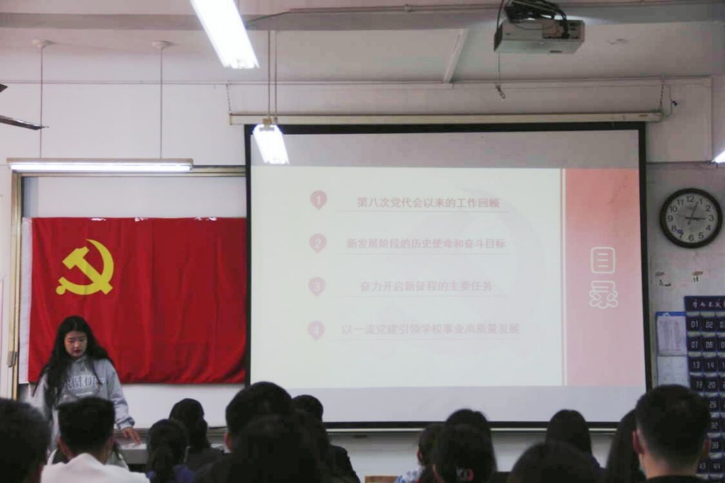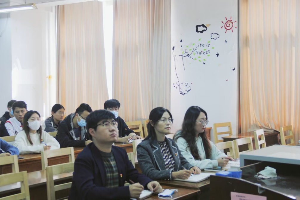 第九次党代会精神”主题党日活动。本科生党支部书记孙宇、团委书记于运清,2021级辅导员孙泽玮、杨丹丹出席会议,本科生党支部全体学生党员参加会议。