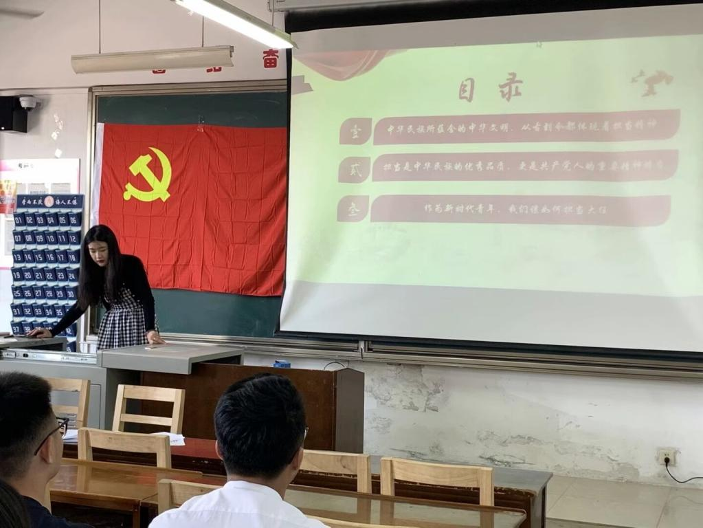 孙宇老师强调担当精神是推动中国式现代化事业前进的重要精神法宝;是党和民族为实现中华民族伟大复兴中国梦的历史使命的重要精神支撑;是青年人在新时代实现自身价值、走好人生长征路的精神秘籍。我们青年人通过党课的学习,应勉励自己为成为有理想、有本领、有担当的新时代青年,为国家前途和民族希望而努力拼搏。为实现中华民族亿万儿女心中的“中国梦”,担当责任,敢作敢为,彰显青春的蓬勃力量,让青春之花绽放在每一个角落。