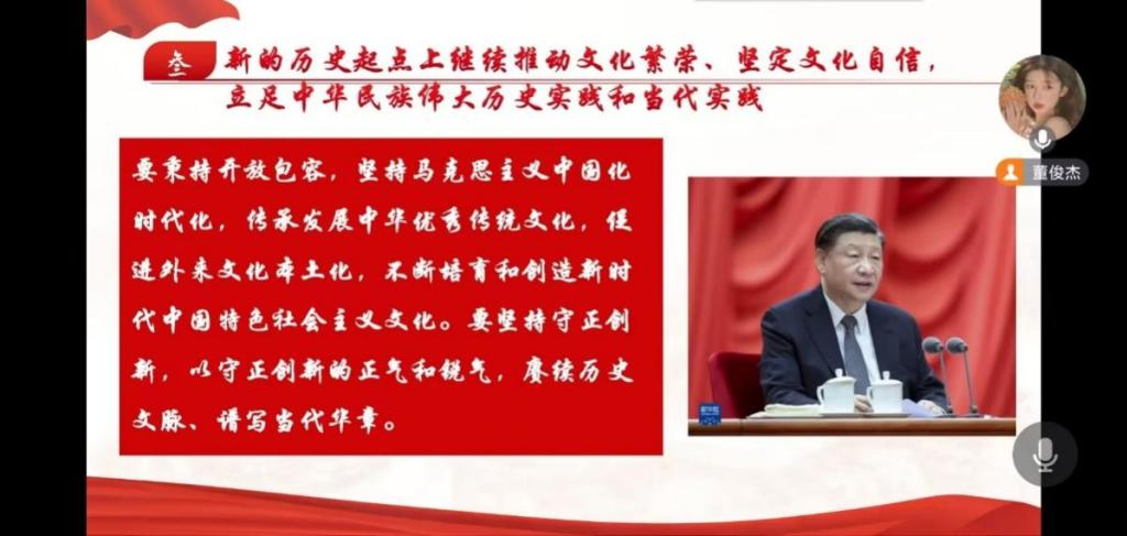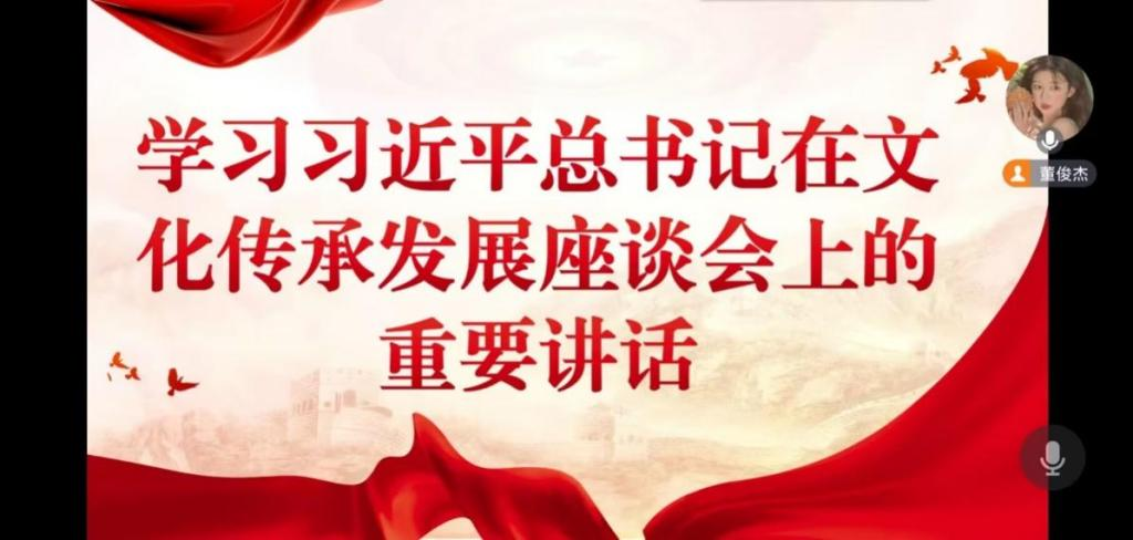 会议伊始,党秘董俊杰指出本次线上主题党课的主题为“学习习近平总书记在文化传承发展座谈会上的重要讲话”。在讲话中,习近平总书记强调,在新的起点上继续推动文化繁荣、建设文化强国、建设中华民族现代文明,是我们在新时代新的文化使命。广大党员要始终坚定文化自信、担当使命、奋发有为,共同努力创造属于我们这个时代的新文化,建设中华民族现代文明。