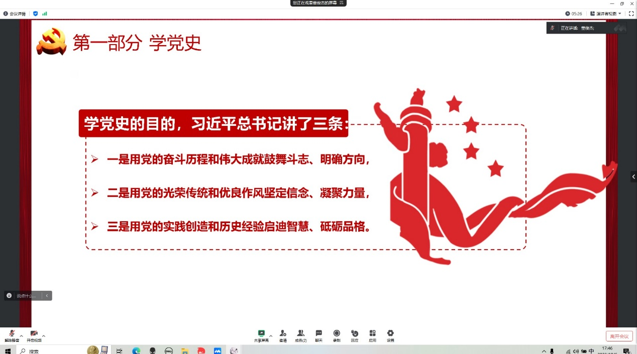 会议伊始,党秘董俊杰指出本次线上主题党课的主题为“学党史,悟思想,办实事,开新局”。董俊杰指出习近平总书记讲的学党史的三条目的:一是用党的奋斗历程和伟大成就鼓舞斗志、明确方向,二是用党的光荣传统和优良作风坚定信念、凝聚力量,三是用党的实践创造和历史经验启迪智慧、砥砺品格。在进入“悟思想”部分后,党秘董俊杰点明习近平新时代中国特色社会主义思想就是把马克思主义基本原理同中国具体实际、历史文化传统、时代要求紧密结合起来,并在实践中不断发展的理论结晶,是对马克思列宁主义、毛泽东思想、邓小平理论、“三个代表”重要思想、科学发展观的继承和发展,是马克思主义中国化最新成果,是当代中国马克思主义,是21世纪马克思主义。