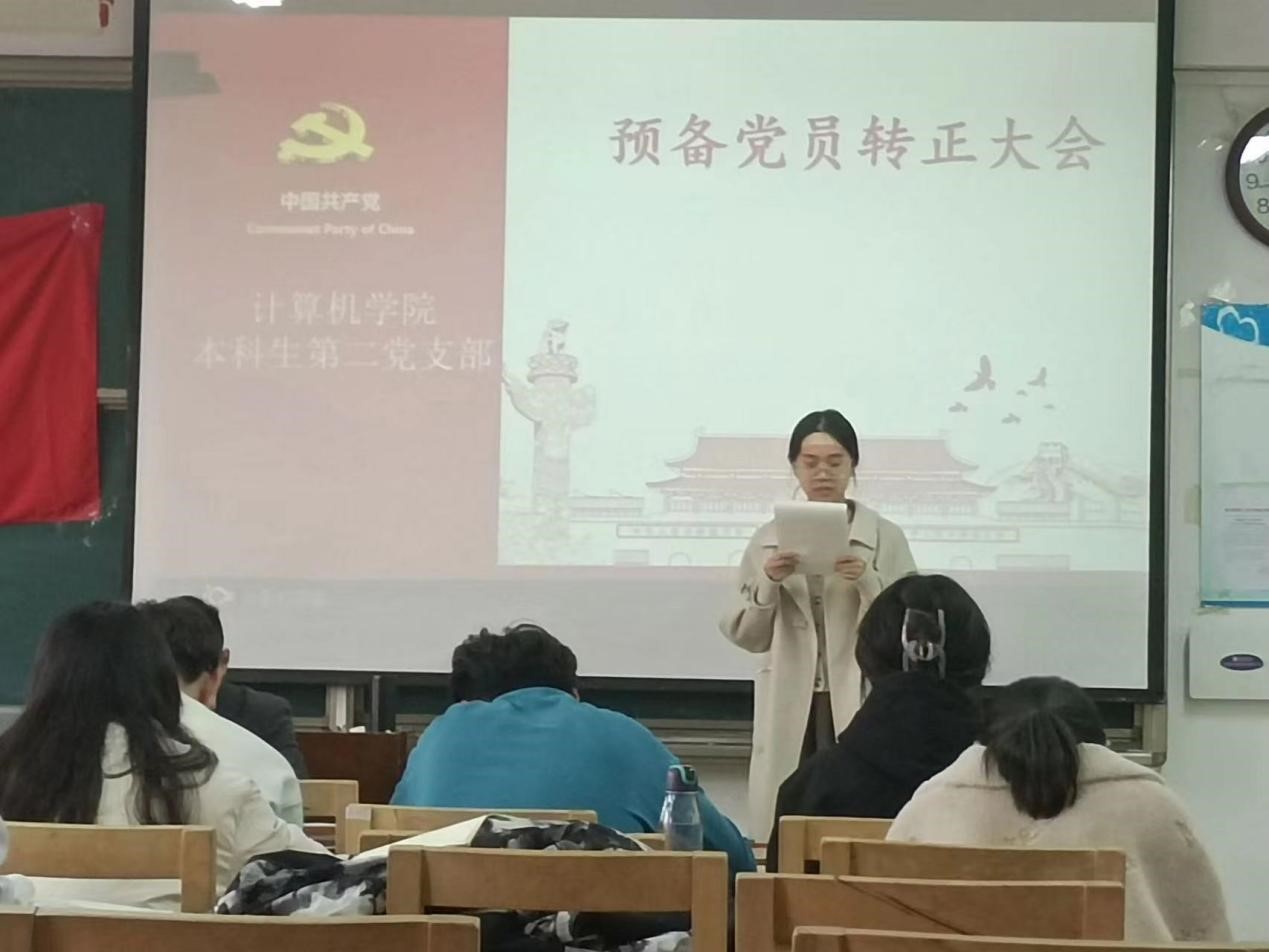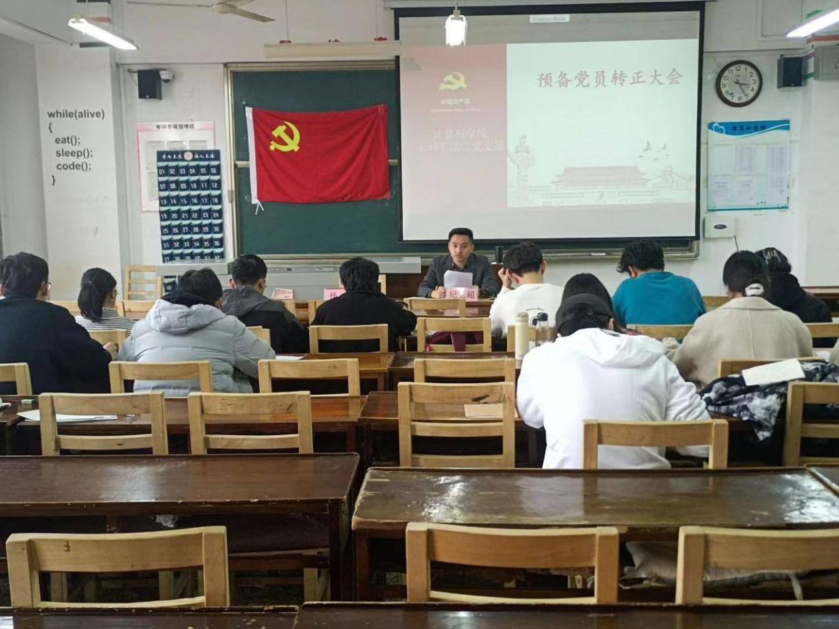 本科生第二党支部于JC407召开预备党员转正大会。本科生第二党支部全体党员参加此次会议。会议由本科生第二党支部书记孙宇主持。