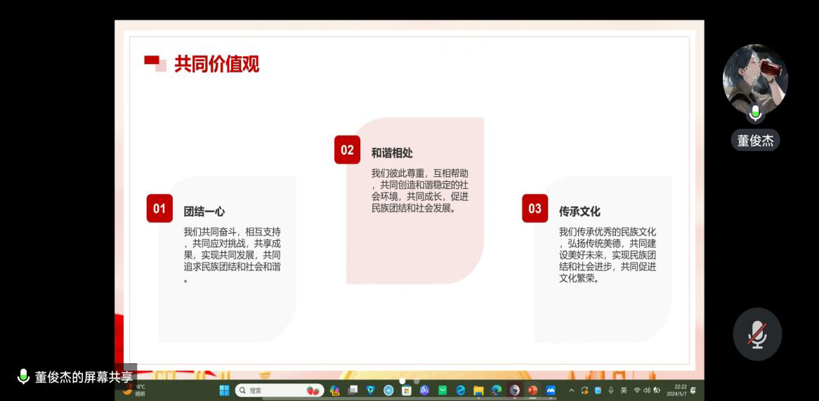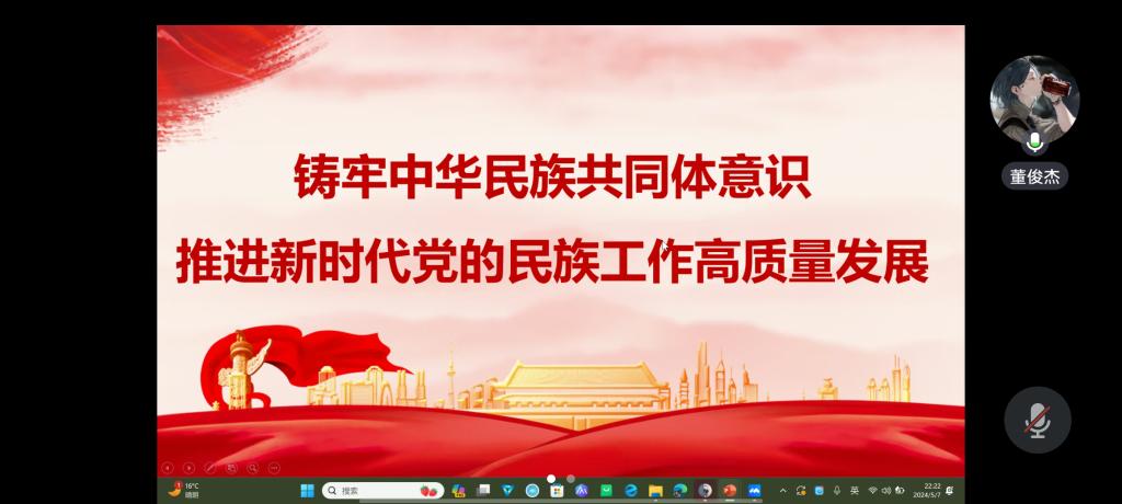 为铸牢中华民族共同体意识,推进民族团结进步事业,2024年2月20日,樱花动漫 本科生党支部召开主题为《铸牢中华民族共同体意识,推进新时代党的民族工作高质量发展》的线上学习党日活动,会议由分党校秘书长董俊杰主持,全体党员参加。