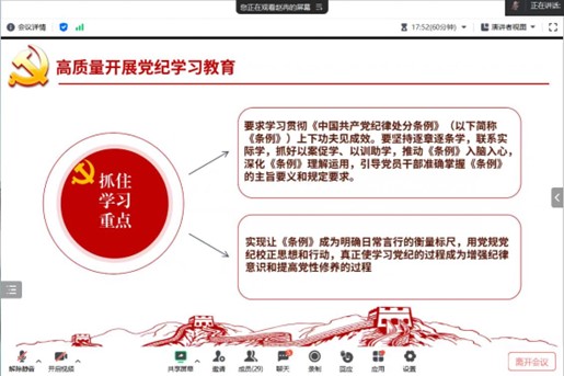 赵冉带领全体党员学习了中国共产党的纪律性,并强调了开展党纪学习教育的要求和重要性。纪律严明是党的光荣传统和独特优势,正是靠着严明的纪律和规矩,中国共产党才能不断取得革命、建设和改革事业的伟大胜利。