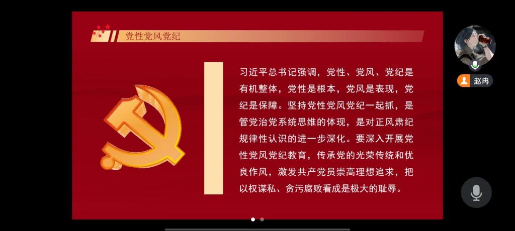 本科生党支部召开主题为《坚持党性党风党纪一起抓》的线上学习党日活动,会议由分党校秘书长赵冉主持,全体党员参加。