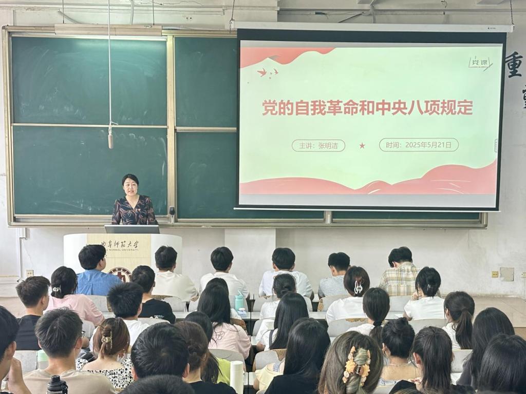 党委书记张明洁在JE103教室为学生干部讲授廉政党课。本次党课以“党的自我革命与中央八项规定”为主题,旨在深入学习贯彻中央八项规定精神,进一步加强学生干部的纪律作风建设,切实增强其责任意识和担当精神。