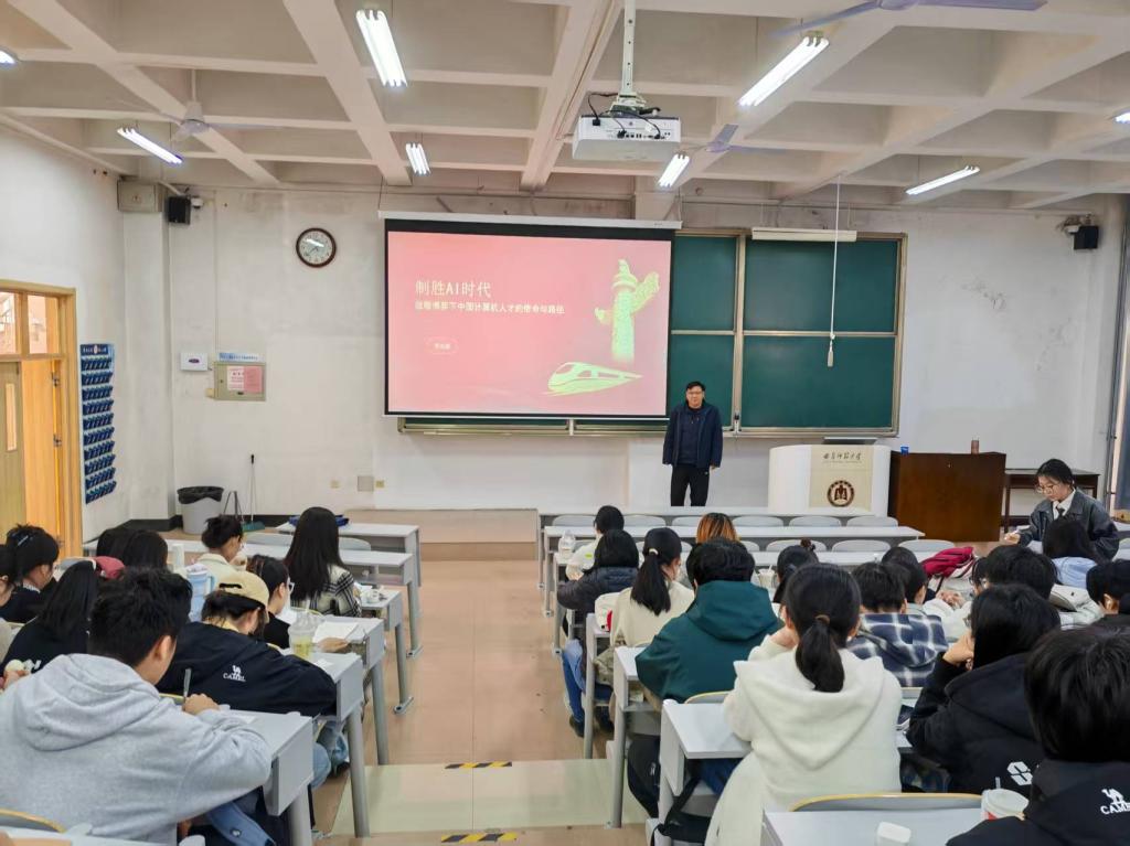 2025年4月15日,院长李光顺以“制胜AI时代,战略博弈下中国计算机人才的使命与路径”为题为2024级本科生带来了一堂深刻而富有前瞻性的思想政治理论课。本次课程旨在引导计算机学子深刻认识在全球人工智能浪潮与国家战略博弈交织的新时代背景下,所肩负的历史重任与成长方向。