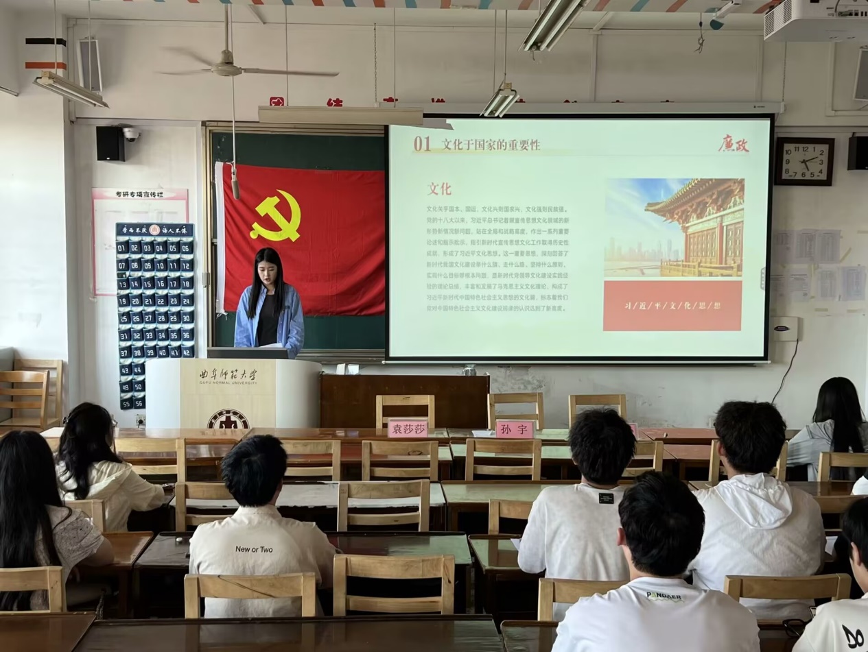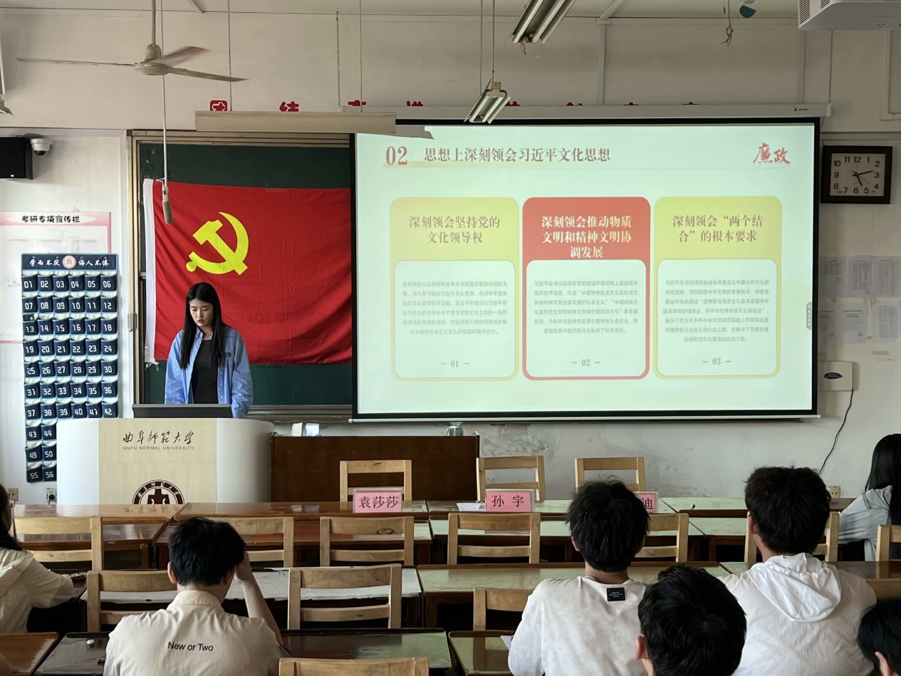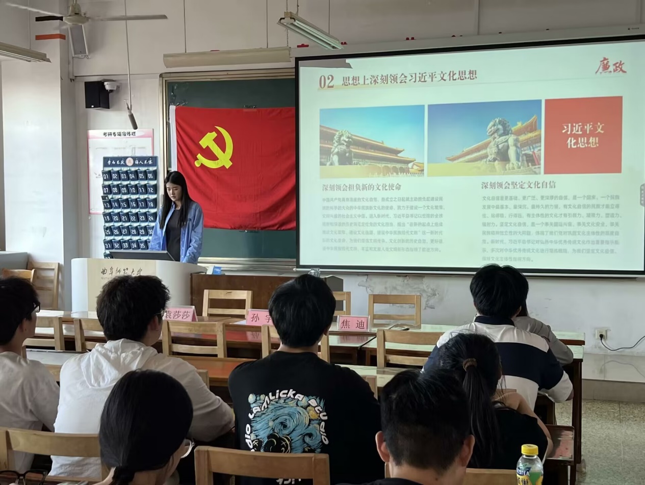 此次党课,孙宇老师重点阐述了习近平文化思想的核心:坚持党的文化领导权,推动物质与精神文明协调发展,并强调了“两个结合”的根本要求,即把马克思主义与中国实际及中华优秀传统文化相结合。并提出我们要深刻认识习近平文化思想的时代价值和指导意义,不断内化为自身的行为准则。